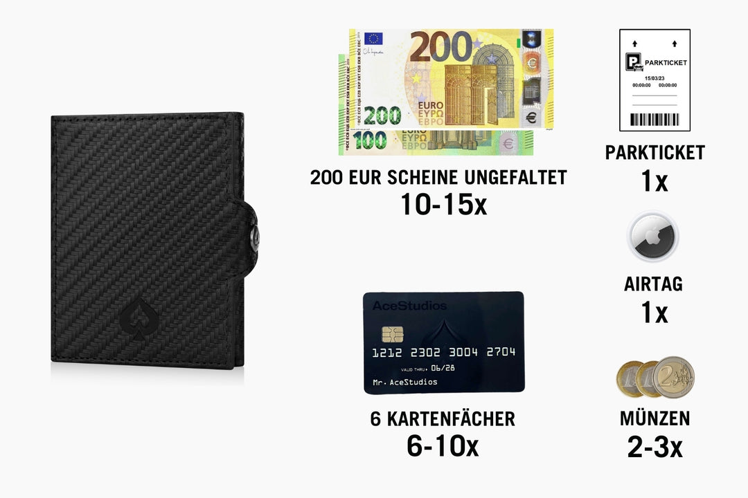 Schluss mit klobigen Geldbeuteln! Unser AceWallet bietet alles, was Deine Geldbörse kann - nur besser. Ein schlankes Wallet aus hochwertigen Materialien mit modernem Design, das genug Platz für deine Karten, Scheine und Münzen bietet.